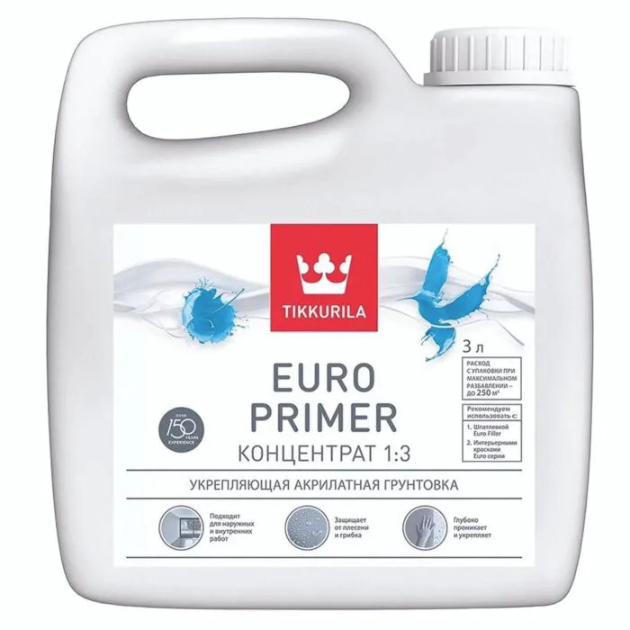 Euro Primer — это водоразбавимая акриловая грунтовка от Tikkurila, предназначенная для укрепления и выравнивания впитываемости пористых и рыхлых поверхностей перед нанесением краски. Обеспечивает лучшее сцепление финишного слоя, снижает расход краски и повышает её долговечность.